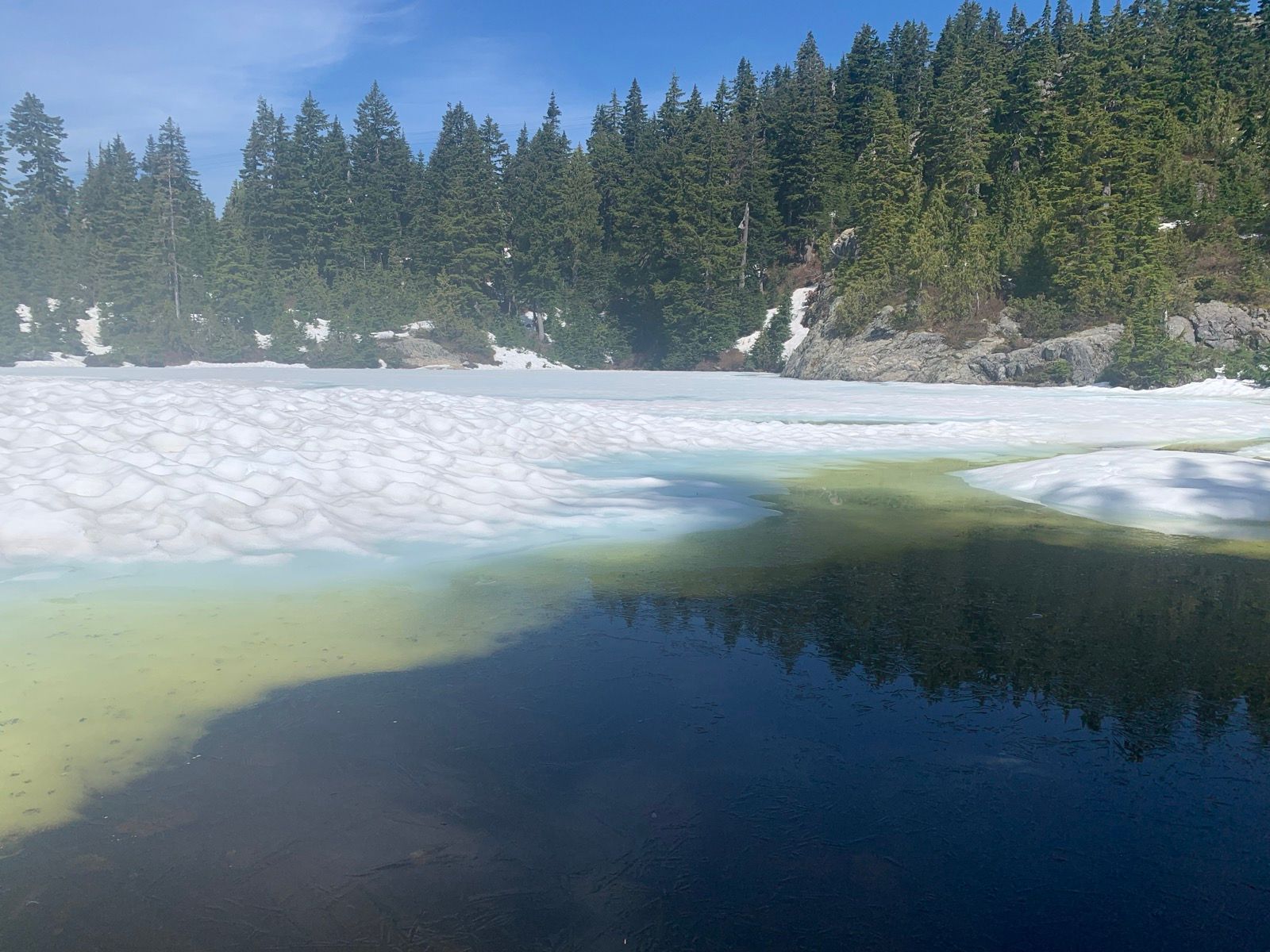 It's currently snow free up to about 950m. Snow is common in shaded areas over 1000m and is constant in shaded areas over 1050m. Around Mystery Lake, Brockton chair and De Pencier itself is still snowy and spikes highly recommended.