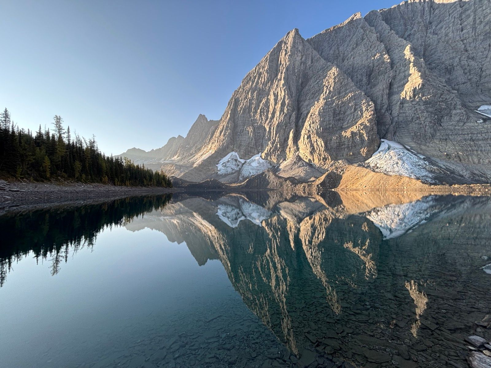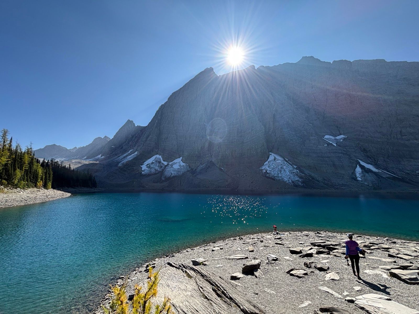 Sunrise on Floe Lake was just spectacular in the morning, just stunning. The sun came up from the west, peeked over the mountain and for about 15 minutes cast an amazing orange glow across Floe mountain. A campsite with a great sunrise makes me so happy.