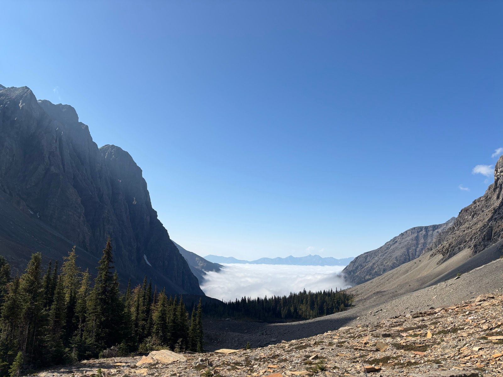 The next day we climb up away from Helmet Falls and across the west side of the Rockwall. The Rockwall is just as described, a huge wall of rock that juts out to the west, looking out over meadows, larches and lakes. Multiple times I thought of The Wall in the Game of Thrones, just nicer.